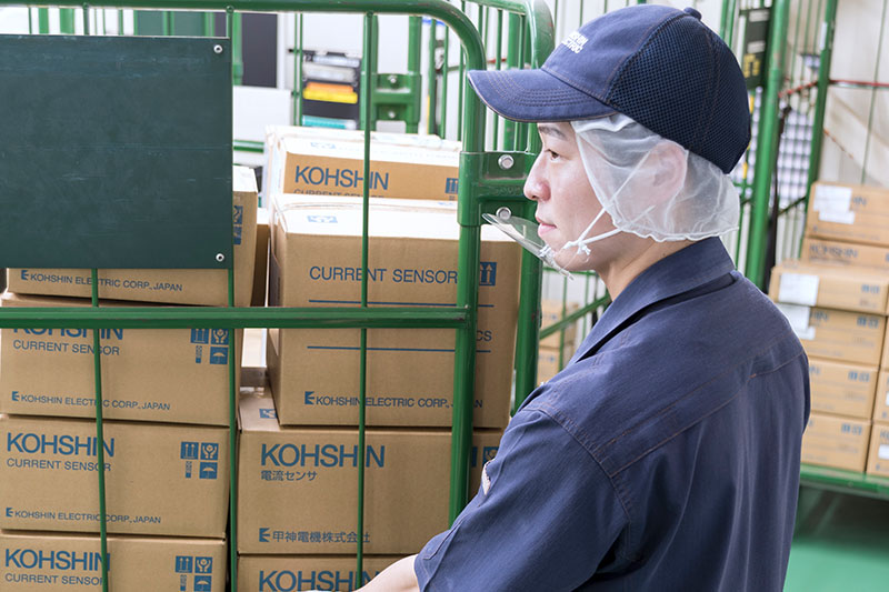 私は産業用電流センサの製品を、お客様のもとへ安全・確実にお届けするために重要な役割である梱包や出荷処理を担当しています。具体的な業務としてはまず、「ばんじゅう」と呼ばれる運搬容器に入った製品が運ばれてくるため、手配票や指示書などに記載された型番などの情報の照合を行います。その後、出荷用の段ボールに製品を入れて梱包し、台車に乗せた後、製品の型番や数の最終チェックを行い納品書を発行して出荷の準備をします。最後に、台車をエレベーターに乗せて製品を出荷する場所へ移動させるところまでが業務の一連の流れとなります。